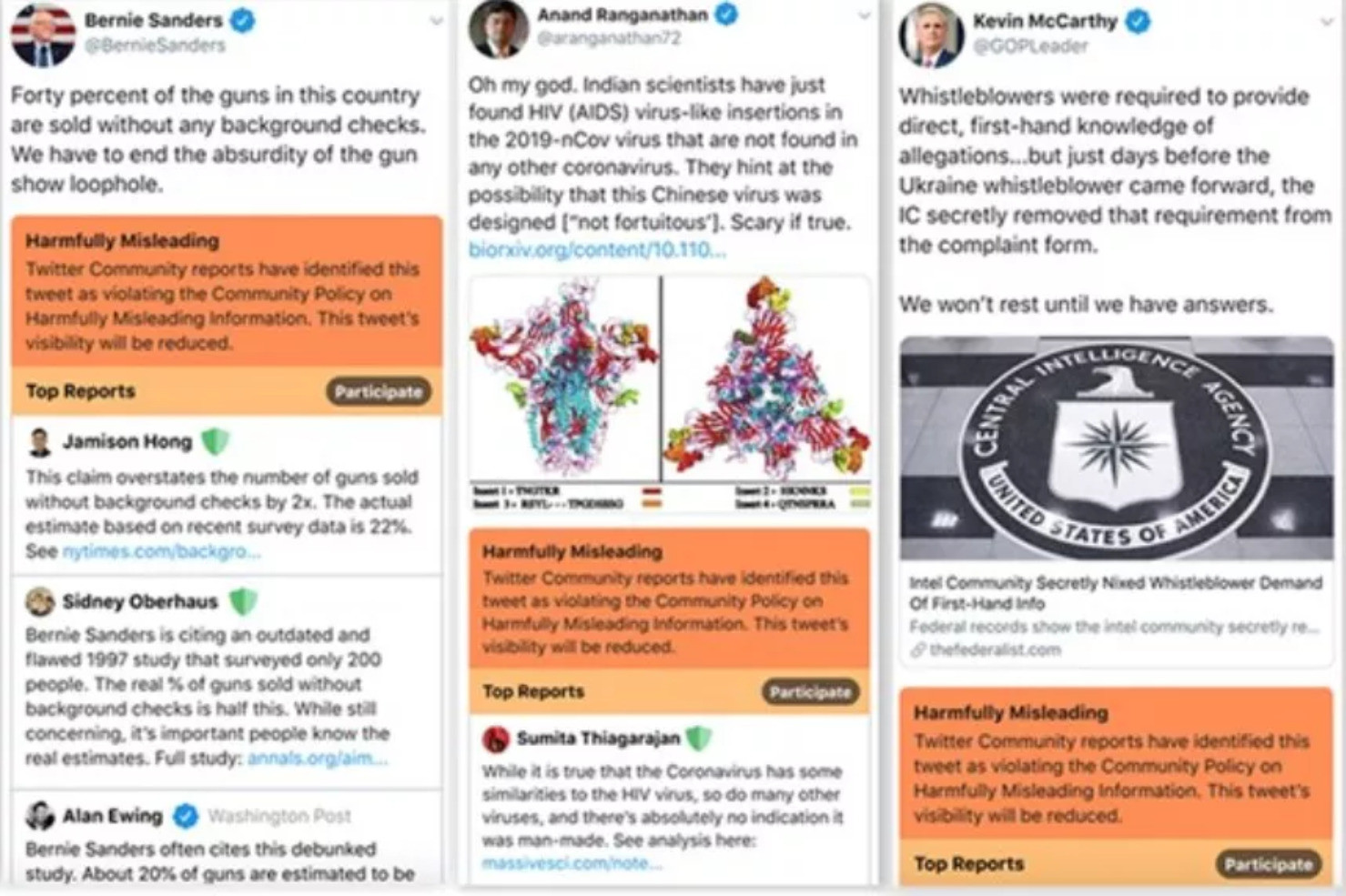 在泄露的演示文件中可以看到来自参议员伯尼·桑德斯、众议院少数党领袖凯文·麦卡锡的推文,他们的不准确推文被加上了橙色的标签。然而目前还不清楚Twitter将如何决定哪些推文将被标记上新标签。