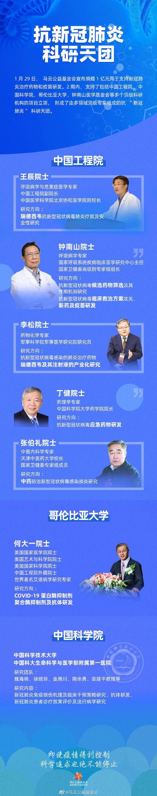 马云公益基金会今日宣布,已与中国工程院、中国科学院、哥伦比亚大学、钟南山医学基金会等多个科研机构完成签约,立项课题总数超10个。1月29日,该机构曾宣布捐赠1亿元用于支持新冠肺炎治疗药物和疫苗研发。