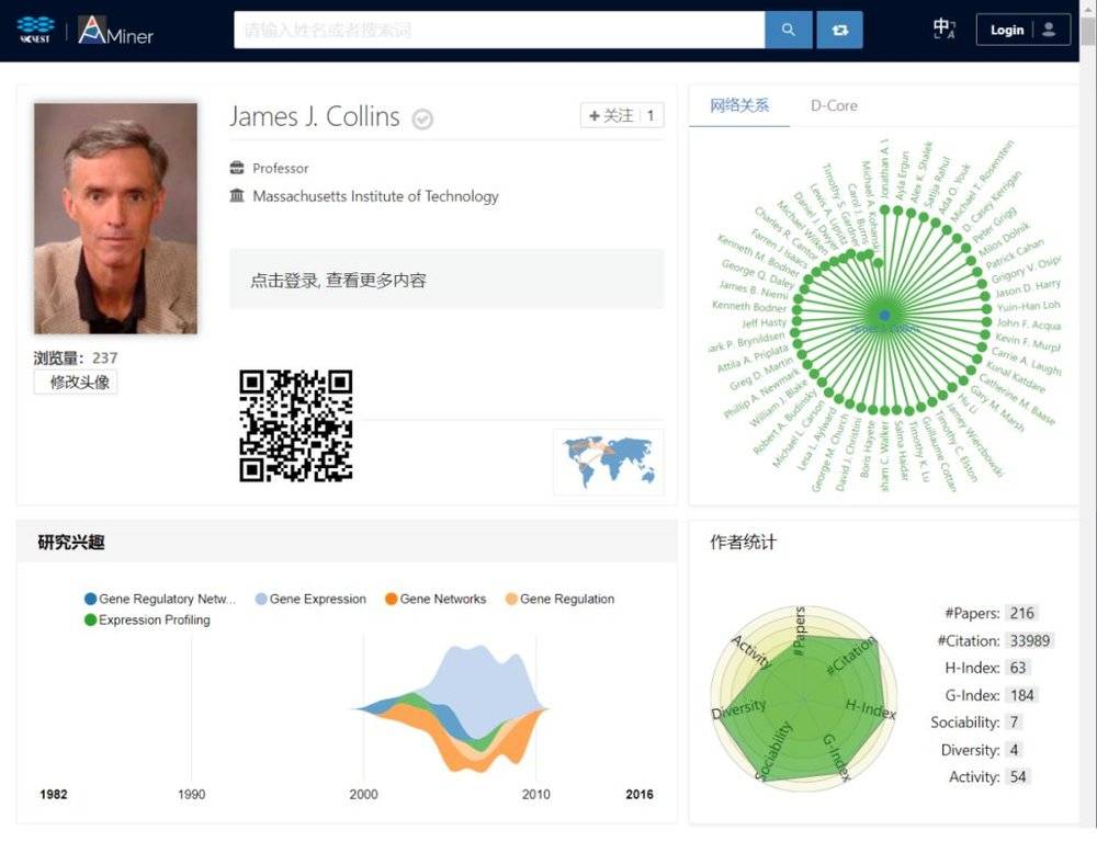 James J. Collins 学术大数据,扫描识别图中二维码查看详情(来源:AMiner)