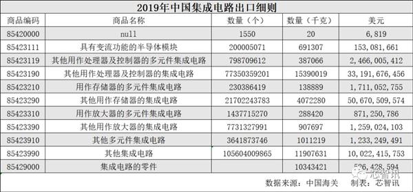 那么2019年中国集成电路对外出口的主要是哪些产品呢?芯智讯通过海关统计数据在线查询平台查询了2019年中国集成电路出口的各类型产品的具体数量和金额,并整理如下: