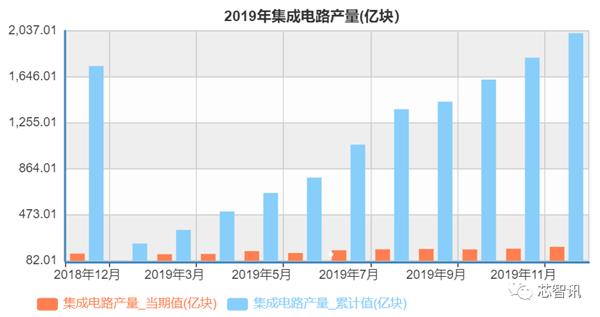 根据国家统计局最新公布的数据显示,2019年全国集成电路产量约为2018.2亿块,与2018年(1739.5亿块)相比增长16%。其中2019年12月份集成电路产量约201.56亿块,与2018年同期相比增长30%。