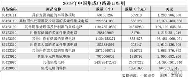 芯智讯通过海关统计数据在线查询平台查询了2019年中国集成电路进口的各类型产品的具体数量和金额,并整理如下: