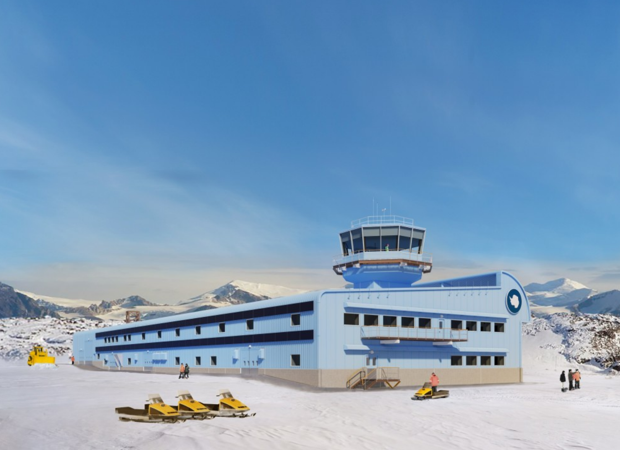 设计者表示,节能,空气动力学的设计面向盛行风,并利用导流板以较高的速度将空气引导到背风面,从而将建筑物周围的积雪降至最低。另外,控制塔从单斜屋顶突出,并360度俯瞰跑道,码头和其他建筑物。建筑物采用的淡蓝色是受南极天空色调的启发,整个建筑物采用复合绝缘金属板和三层玻璃构成,以形成一个密封和热效率高的外壳,从而最大限度地减少能源使用。