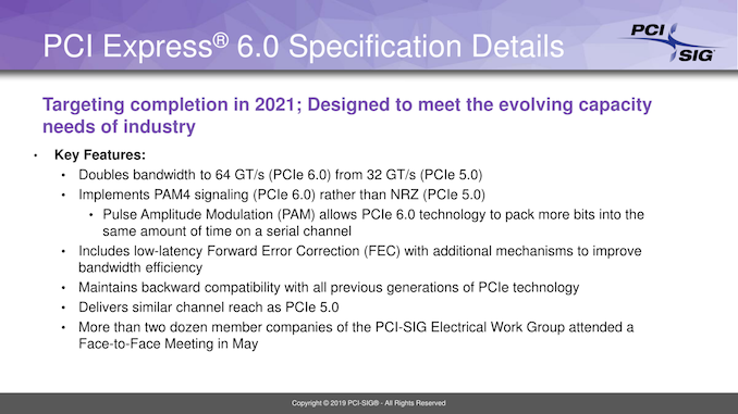 0.3版本被视为一个概念,概述了该技术的关键特性和体系结构。在PCIe 6.0的情况下,我们讨论的是每通道速度64 GT/s、4级脉冲幅度调制(PAM-4)编码和前向纠错(FEC)。0.5版本被认为是规范的初稿,因此它涵盖了体系结构的所有关键方面,包括相关方(PCI-SIG内部)对0.3版本的反馈。此时,组成员将能够添加新功能。