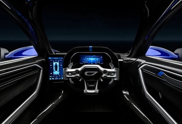 虽然超级跑车的车内空间通常都会捉襟见肘,但Czinger C21的车内空间可以用小得可怜来形容,单座的布局让其车厢十分狭窄,驾驶者的眼前,仅有方向盘、液晶仪表以及一个尺寸不大的液晶显示屏。