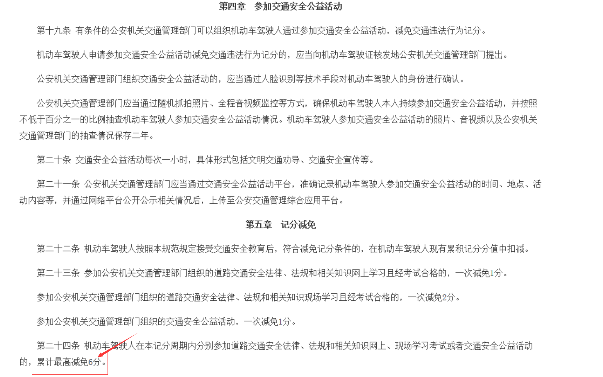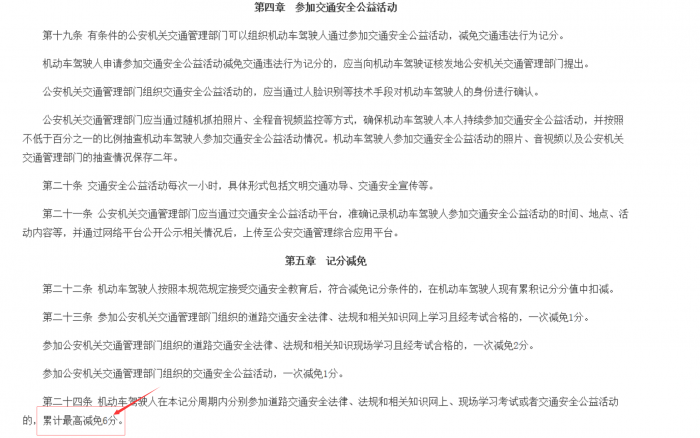 《通知》规定“机动车驾驶人在本记分周期内分别参加道路交通安全法律、法规和相关知识网上、现场学习考试或者交通安全公益活动的,累计最高减免6分”,3月1日起全国正式实施。
