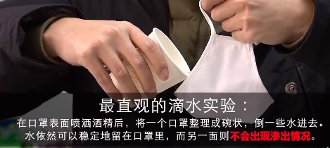 从记者的现场演示来看,在口罩表面喷洒酒精后,将一个口罩整理成碗装,倒一些谁进去。水依然可以稳定地留在口罩里,而另一面则不会出现渗出的情况。