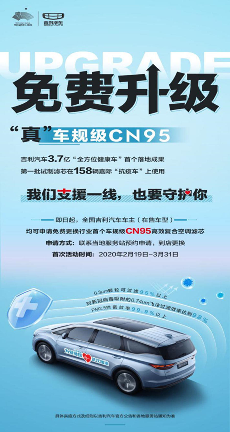 从即日起到3月31日,全国吉利汽车车主(在售车型)均可联系当地服务站预约申请,免费更换“车规级CN95空滤”,享受N95口罩级的出行安全防护。