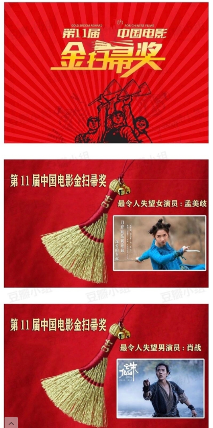 “金扫帚奖”是模仿美国金酸梅奖设置的一个以评选最差电影为主的电影奖项,旨在用另一种声音关注电影的发展,以电影批判来影响电影创作,是为鞭策电影发展而设立的一个奖项。直至2020年,金扫帚奖已经举办了11次,该奖每年都有不少电影人及其作品入围该提名,最后由专业影评人投票选出结果。