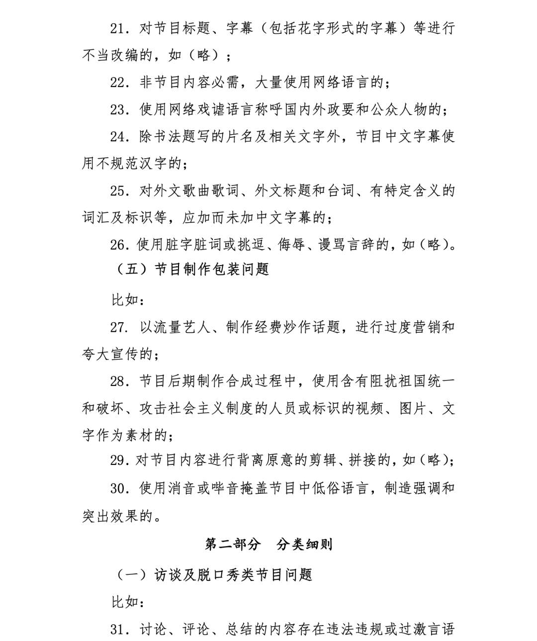 按照国家广播电视总局工作部署,在总局网络视听节目管理司指导下,中国网络视听节目服务协会联合央视网、芒果TV、腾讯视频、优酷、爱奇艺、搜狐、哔哩哔哩、西瓜视频、快手、秒拍等视听节目网站制订了《网络综艺节目内容审核标准细则》,于2月21日发布。