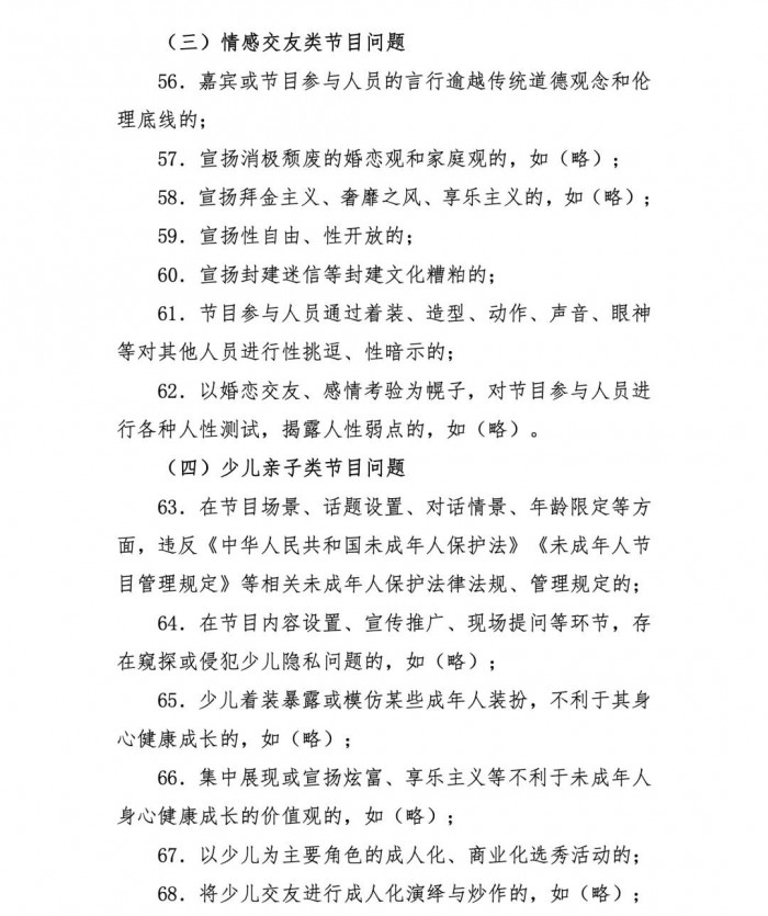 针对情感交友类节目问题,《细则》规定,不得宣扬拜金主义、奢靡之风、享乐主义;不得以婚恋交友、感情考验为幌子,对节目参与人员进行各种人性测试,揭露人性弱点。