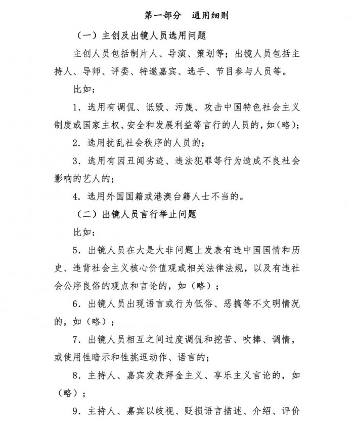 《细则》提出,综艺节目的主创及出镜人员,不得选用因丑闻劣迹、违法犯罪等行为造成不良社会影响的艺人;不得出现选用外国国籍或港澳台籍人士不当的情况。