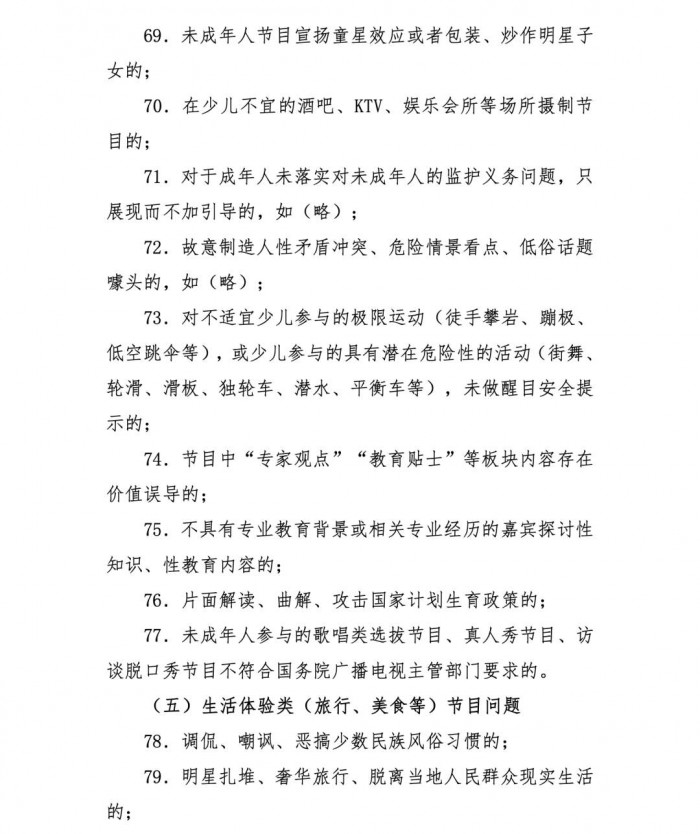 少儿亲子类节目不得出现少儿着装暴露或模仿某些成年人装扮,不利于其身心健康成长的情况;不得集中展现或宣扬炫富、享乐主义等不利于未成年人身心健康的价值观;未成年人节目不得宣扬童星效应或者包装、炒作明星子女。