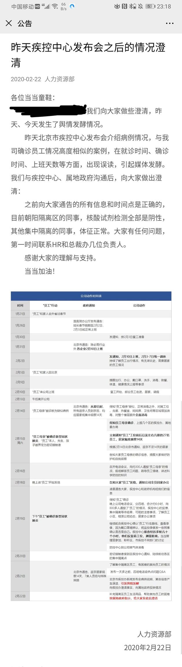 昨天21号北京市疾控中心发布会介绍病例情况,我司员工的案例,在就诊、确诊、上班天数等方面,有误差、误读,在媒体上发酵,引发对我们的谩骂和攻击。我们与疾控中心、属地政府沟通后,向大家做出澄清: