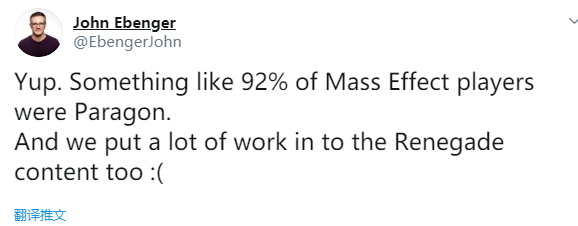 他在推特上表示同意玩家在虚拟世界中也偏向于循规蹈矩的结论,并称“92%的《质量效应》玩家都偏向Paragon(游戏中的善),明明我们在Renegade(恶)的选项后续内容也投入了很大量的工作,难过。”