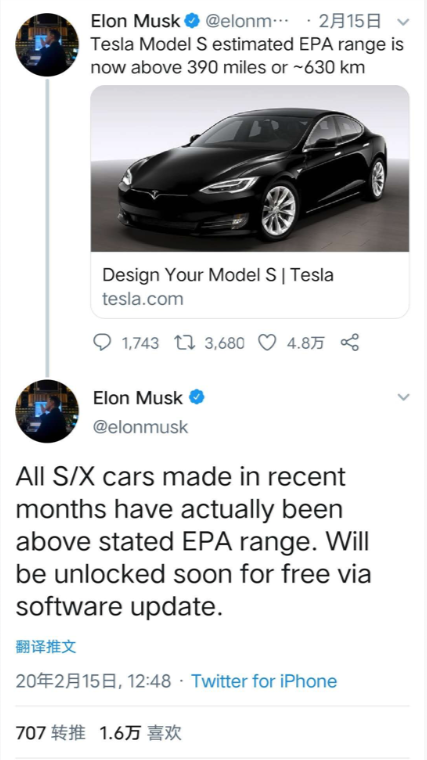 马斯克近期在推特发布了一条信息称:“特斯拉Model S的EPA续航已经升级至390英里(630公里),近几个月生产的特斯拉Model S/X续航都已经超过了EPA测试的标称续航,同时将会通过OTA升级给现有用户升级,提高续航。”