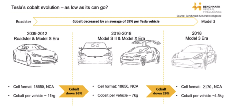 由于上述多种原因,其实行业内多家企业都在寻求答案,即便暂时找不到替代品,也想方设法减少钴的使用。例如特斯拉历代采用的锂离子电池,其实一直在减少钴的使用。
