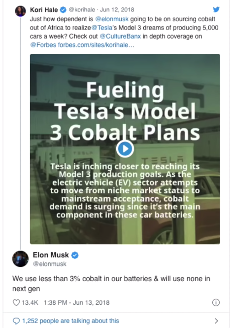 根据2018年马斯克在推特的消息,特斯拉所采用的电池,其钴的使用已经低至3%,并且称下一代电池产品将会杜绝钴的使用。
