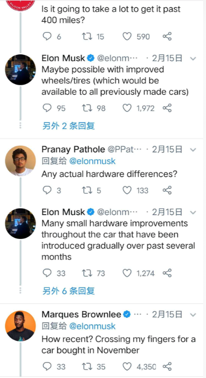 官网Model 3续航数据已经从此前的373英里(600公里)改为了390英里(630公里),Model X续航数据从此前的328英里(528公里)改为了351英里(565公里)。且根据马斯克所说,该数据依然是保守估计,如果更换轮胎续航能超过400英里(644公里)。