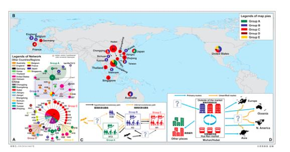 而与华南海鲜市场有关联的患者样品的单倍型都是 H1 及其衍生的单倍型 H2 及 H8-H12 ,这表明市场在短期内存在传播感染。此外,有一份武汉样品单倍型 H3 与华南海鲜市场无关,研究人员认为,H1 及其衍生的单倍型可能起源于 H3 ,华南海鲜市场不存在新冠病毒原始来源,新冠病毒可能是从其它地方输入。此前的研究也显示,首先确定的受感染患者与市场没有联系,因而研究者认为可能是感染者将病毒传播给市场上的工人或卖方,然后迅速在市场上流通,拥挤的市场促进了病毒进一步传播给买家,并于 2019 年 12 月上旬传播开来。