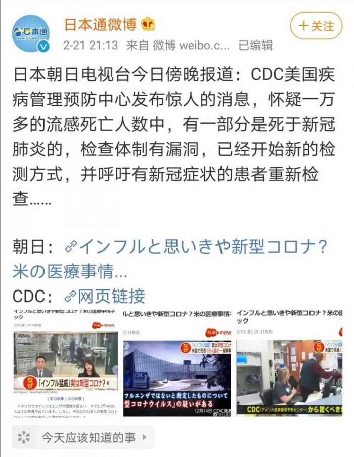 日本朝日电视台昨日傍晚报道,宣称“ CDC 美国疾病管理预防中心发布惊人的消息,怀疑一万多的流感死亡人数中,有一部分是死于新冠肺炎的,检查体制有漏洞,已经开始新的检测方式,并呼吁有新冠症状的患者重新检查……”