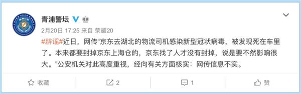 通报全文如下↓↓↓近日,我市一网民在网上传播“京东从湖北去上海的物流司机感染新冠病毒,被发现死在车里了”,并称“京东上海仓库要封闭,不要买京东吃的了”。2月20日,上海市公安局青浦分局通过官方微博进行了辟谣。