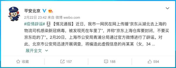 2月22日深夜,@平安北京 发布情况通报,肖某某因造谣“京东物流司机感染新冠病毒死亡”,已依法行政拘留。