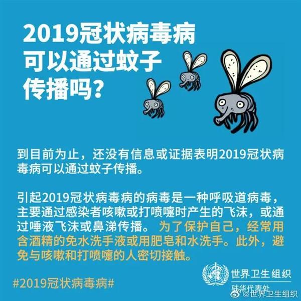 针对新冠病毒是否会通过蚊子传播,世卫组织表示,到目前为止,没有信息或证据表明COVID-19可以通过蚊子传播。
