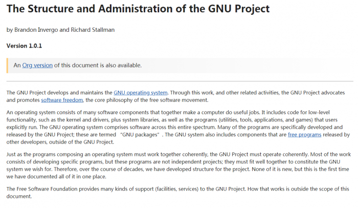 为了描述清楚 FSF 与 GNU 之间的关系,并使 GNU 更加透明,Richard Stallman 宣布了一份文件,其中概述了 GNU 的结构和管理。