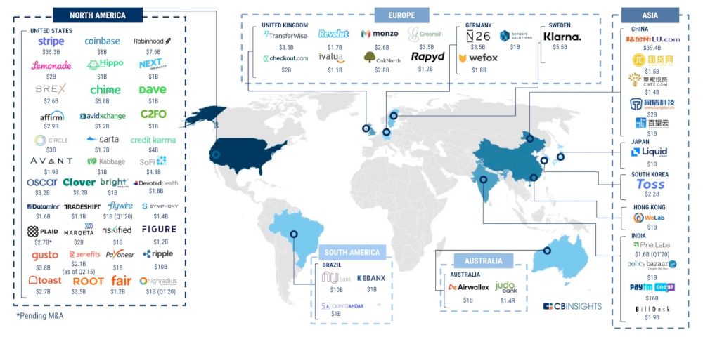 2019年出现了24家新的金融科技独角兽:其中在第四季度有Next Insurance,Bight Health,Flywire,High Radius,Ripple和Figure在内的8家金融科技初创公司获得这个称号,此外还有16家企业在其他季度获得。