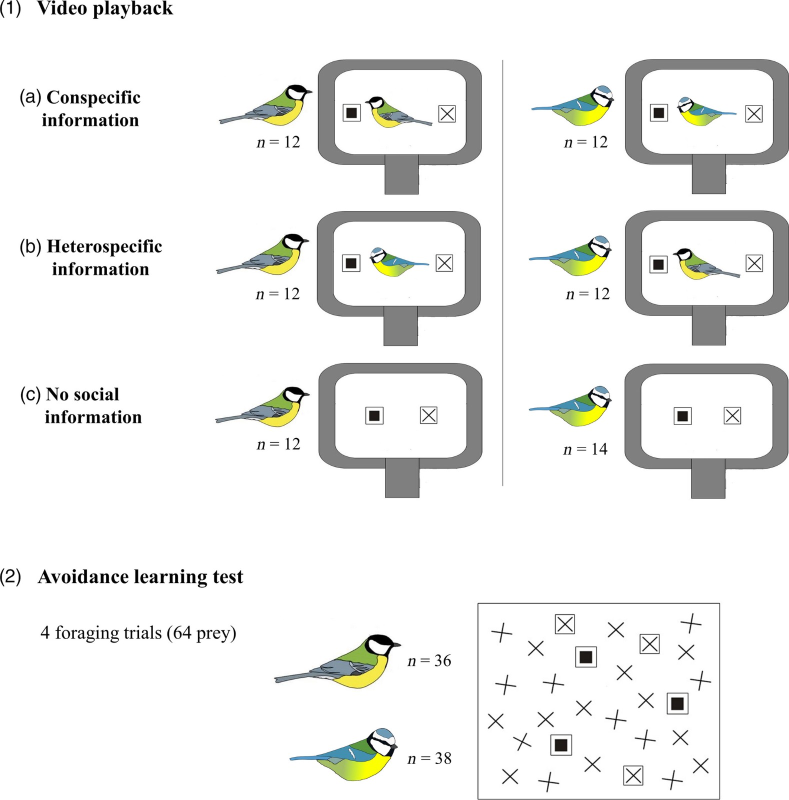 电视上的鸟类对难吃的食物的反应不一,包括摇摇头和大力擦拭喙。在观看电视上的鸟类吃东西时的行为之后,蓝雀和大山雀都少吃带有正方形的苦味包。