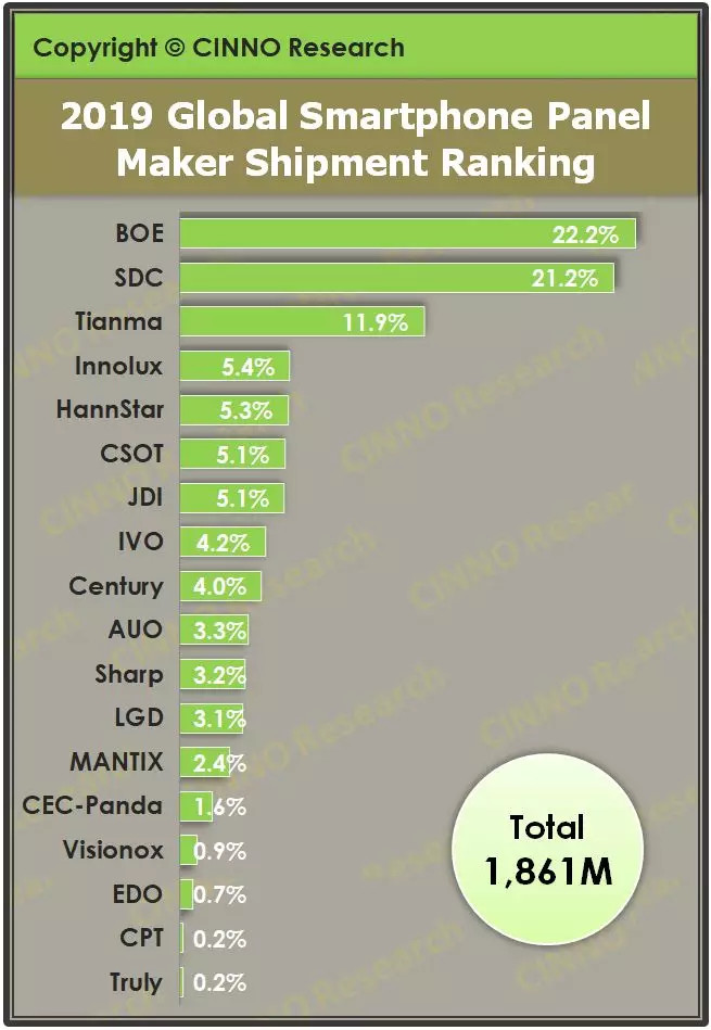 统计全球18家智能机面板厂商出货数据,2019年中国面板厂商京东方BOE出货量首度超过韩国三星显示SDC,成为全球第一大智能机面板厂商。全球前十大智能机面板厂商出货占比87.8%,分别为No.1京东方BOE、No.2三星显示SDC、No.3天马Tianma、No.4群创光电Innolux、No.5瀚宇彩晶HannStar、No.6华星光电CSOT、No.7日本显示器JDI、No.8龙腾光电IVO、No.9深超光电Century、No.10友达光电AUO。