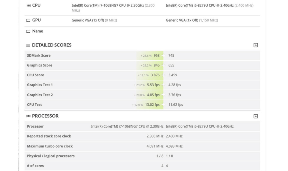 虽然在参数上,Core i5-8279U 与 i7-1068NG7 比较相似,但实际性能却截然不同。i7-1068NG7 在 3DMark Time Spy 中的图形分数达到了 846,比 i5-8279U 高了 29%;CPU 分数达到了 3876,比 Core i5-8279U 高了 12.1%。