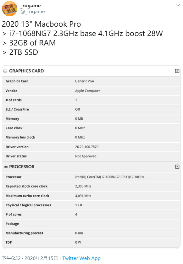 综合以上种种,我们认为新款 MacBook Pro 13 配置 i7-1068NG7 还是比较确信的。猜测 i7-1068NG7 与 i7-1068G7 采用不同的封装,或能带来更高的频率和更优秀的发热控制,不过应该属于要加钱的选项。