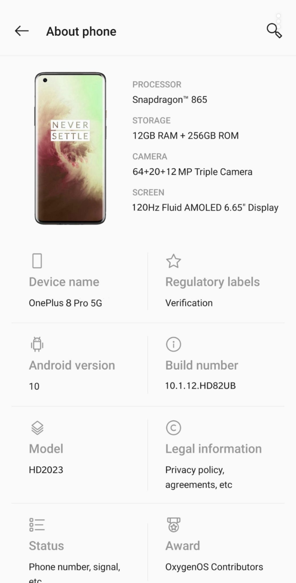 网上关于一加8系列新机的消息越来越多,看来提前到4月份发布希望较大。日前,国外爆料人晒出一张疑似一加8 Pro 5G“关于手机”页面的截图,该机的不少配置信息一目了然。