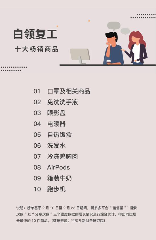 2月24日消息,日前,拼多多对平台消费数据尤其是三线以上复工密集城市的消费数据进行了分析,得出“白领复工10大热销商品”榜单。其中,既有口罩及相关衍生品,自热饭盒、眼影盘等商品上榜。从拼多多平台数据来看,口罩及口罩相关产品持续热销。