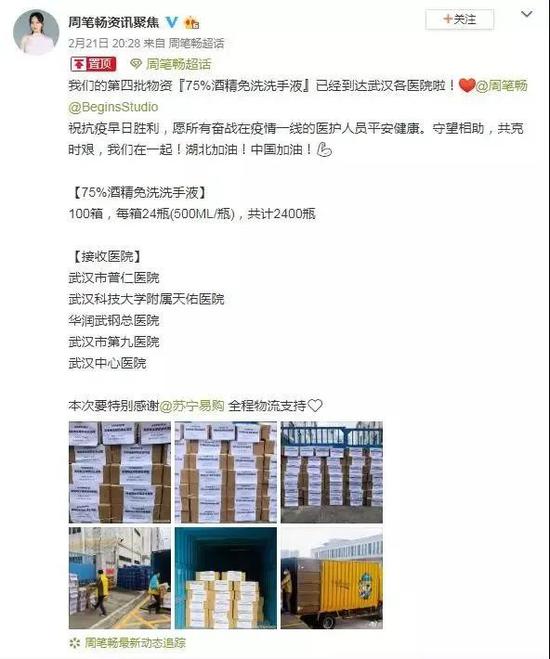 在了解到周笔畅全球歌迷会的物资运输需求后,苏宁物流绿色通道第一时间调拨车辆,从深圳连夜拉回物资,用1天时间完成了全市5家医院的物资配送工作。