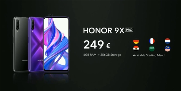 荣耀9X PRO在海外提供的是6GB+256GB配置版本,价格249欧元,约合人民币1900元,3月起陆续上市。国内版目前为8GB+128GB 1999元、8GB+256GB 2199元。