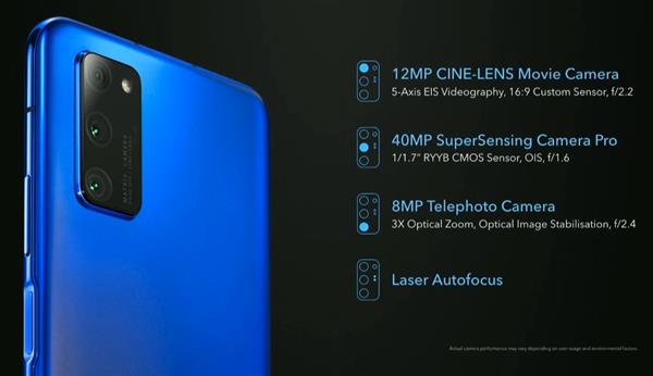在拍照上,荣耀V30 Pro采用双主摄方案,增加1200万独立电影镜头(支持五轴视频智慧防抖,16:9定制传感器、f/2.2)。主摄为4000万超感光主摄PRO版(1/1.7英寸、RYYB传感器,支持OIS光学防抖、f/1.6)。搭配800万长焦镜头(3倍光学变焦、OIS光学防抖、f/2.4)以及激光传感器。