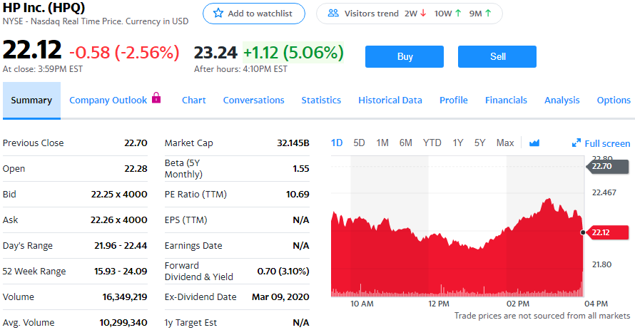 惠普星期一在纽交所的开盘价为22.28美元。截至收盘,惠普股价下跌0.58美元,报收于22.12美元,跌幅为2.56%。截至美国东部时间2月24日下午4:48(北京时间2月25日早上5:48),盘后交易中惠普股价上涨1.15美元,涨幅为5.2%,暂报23.25美元。过去52周,惠普股价最高为24.09美元,最低为15.93美元。