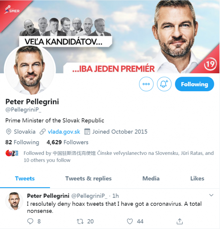 近日,针对多家媒体关于斯洛伐克总理佩列格里尼疑似感染新冠肺炎的报道,2月24日晚上,佩列格里尼在其社交媒体账号上表示,“有人在推特上炮制我感染新冠肺炎的恶作剧。真是一派胡言!”
