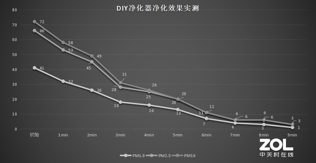 噪音测试:在环境噪音为34dBA下对DIY净化器噪音进行测试,最大风速下噪音测得49dBA,相比起风道经过改良的正规空气净化器来说,同等风量下DIY净化器的噪音大了不少,最大风速下噪音虽然能接受,但并不适宜长期使用。日常使用时,将风速开到一半左右比较好,当然,净化效率也会慢不少。