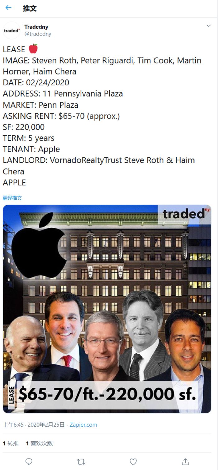 根据消息称该租赁计划为期5年,之后苹果可能会搬出来,因为有报道称苹果仍渴望找到一个更持久的办公场所。该租约为苹果提供了更大的办公空间,除了在曼哈顿的七个Apple Store商店外,它还在第五大道100-104号租赁了45,000平方英尺的办公室。