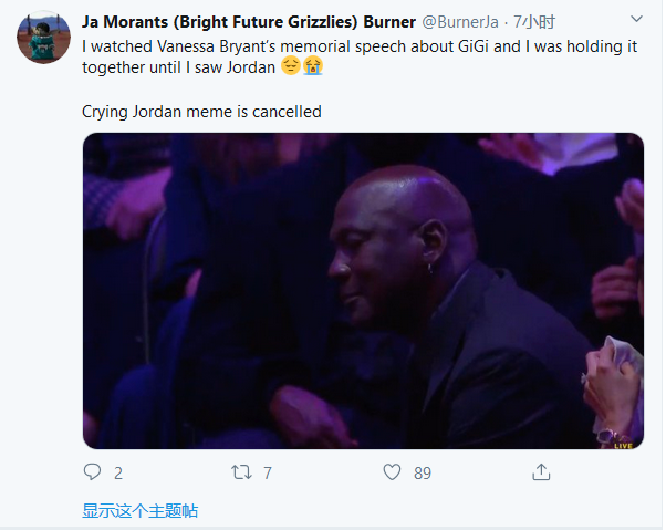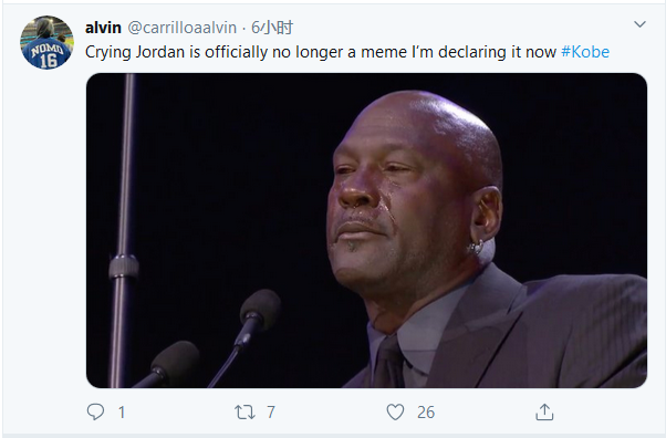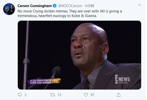 另一位编辑写道:“我观看了凡妮莎·布莱恩特(Vanessa Bryant)关于GiGi的纪念演讲,而且乔丹的演讲让我感触很多。Crying Jordan模因被取消了。”