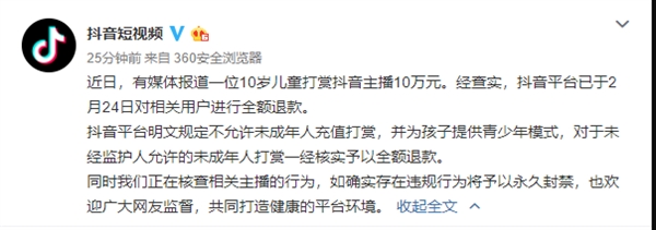 如今各种网络主播成为万众追捧的网红,随时笑纳网友打赏,但其中也不乏不理智的网友,甚至是未成年人巨额打赏主播。 2月25日消息,抖音在其官方微博发布声明称,针对近日媒体报道一位10岁儿童打赏抖音主播10万元。经查实,抖音平台已于2月24日对相关用户进行全额退款。