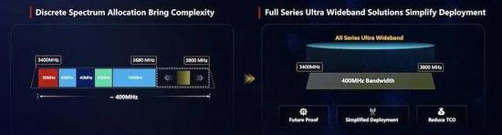但 5G Massive MIMO AAU 有单个模块就能支持 400MHz 的超大频宽,只需一个模块,就可以把各个运营商在400MHz以内的离散频谱都利用起来(图右上),并通过载波聚合来打通所有谱段,增加各个频谱之间的传输效率。运营商就能以较少的设备数量、使用更多的频段,藉此简化了网络站点的部署,同时降低购买、使用和运营成本。