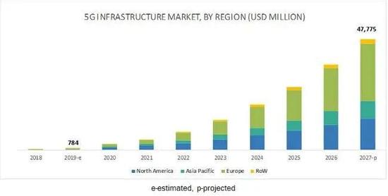 首先,华为的崛起正好遇上智能手机大爆发的阶段、以及运营商部署 5G 的时间点,5G 网络基础设备的成本,又远比 3G 和 4G 更昂贵,所以网络基础设备成为了一盘巨大的生意。要知道高通 2019 年全年收入,约为 243 亿美元,但根据 Markets and Markets 的调查资料,2027 年全球的网络基础设备市场,合计约有 478 亿美元的规模,而当中超过一半在欧洲(上图)。