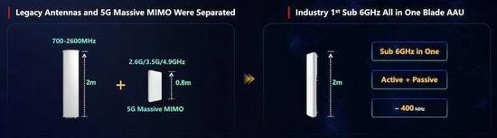 此外,以往的 5G 天线与 4G 天线,需要分别设置(图左上),占据大量的基站部署空间。但华为的 5G Massive MIMO AAU 提供了一个能支持所有频段和制式的刀片 AAU,能将 2G、3G 和 4G 等无源天线模块,全部集成在一起,并将总高度控制在了 2 米左右(图右上)。因此,运营商就能直接以 5G 模块取代 3G/4G 天线,大幅节省基站空间,也缩短站点安装时间和部署的周期。
