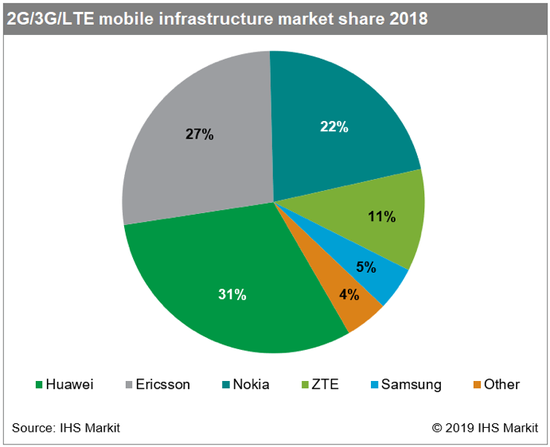 跟据华为提供的数据,到目前为止全球已经有 91 个运营商,与华为正式签署5G商用合同,当中最少有一半以上 (47 家) 是欧洲地区的运营商。虽然华为所签的协议,并不一定具有排他性,运营商也有可能在与华为合作的同时,也采购其它供应商的方案。但是根据少数公开的网络基础设备市场研究(上图),华为在 2018 年就成为了全球最大的基础设备供应商。