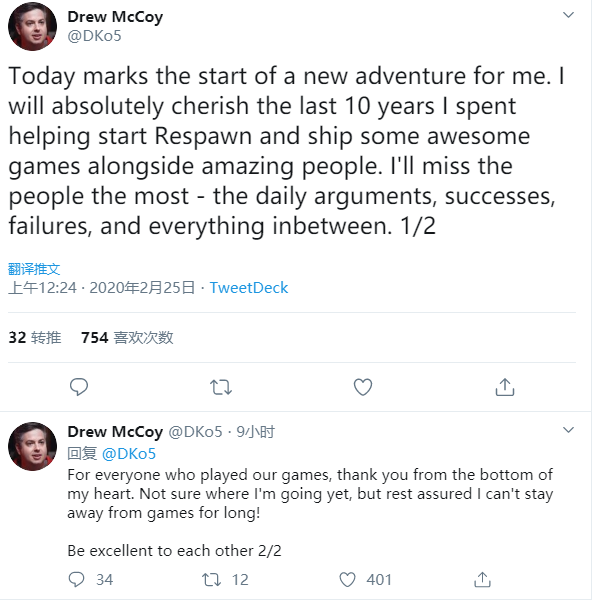 重生工作室的元老,创始成员之一的Drew McCoy在推特上正式宣布了其离职的消息,并表示绝对珍惜在工作室度过的这段时光。2010年动视和老IW因为《使命召唤》撕破脸后,McCoy跟随着老IW的创始人Vince Zampella和Jason West一同创立了重生工作室。